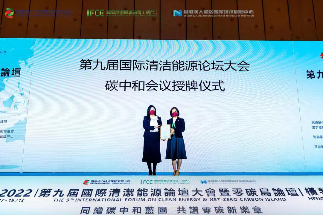 本届论坛首次在珠海横琴举办。CQC中国质量认证中心作为国家权威的第三方核查认证机构,受金诺碳投环保科技(北京)有限公司委托,依据《大型活动碳中和实施指南》(DB11/T 1862-2021)对本届论坛期间的碳排放进行现场核查和核算,确定本届论坛通过使用碳信用抵消的方式实现了碳中和,并为论坛组委会颁发“碳中和”评价证书。由此正式确认“第九届国际清洁能源论坛暨零碳岛论坛”成为“碳中和”的大型国际论坛活动。