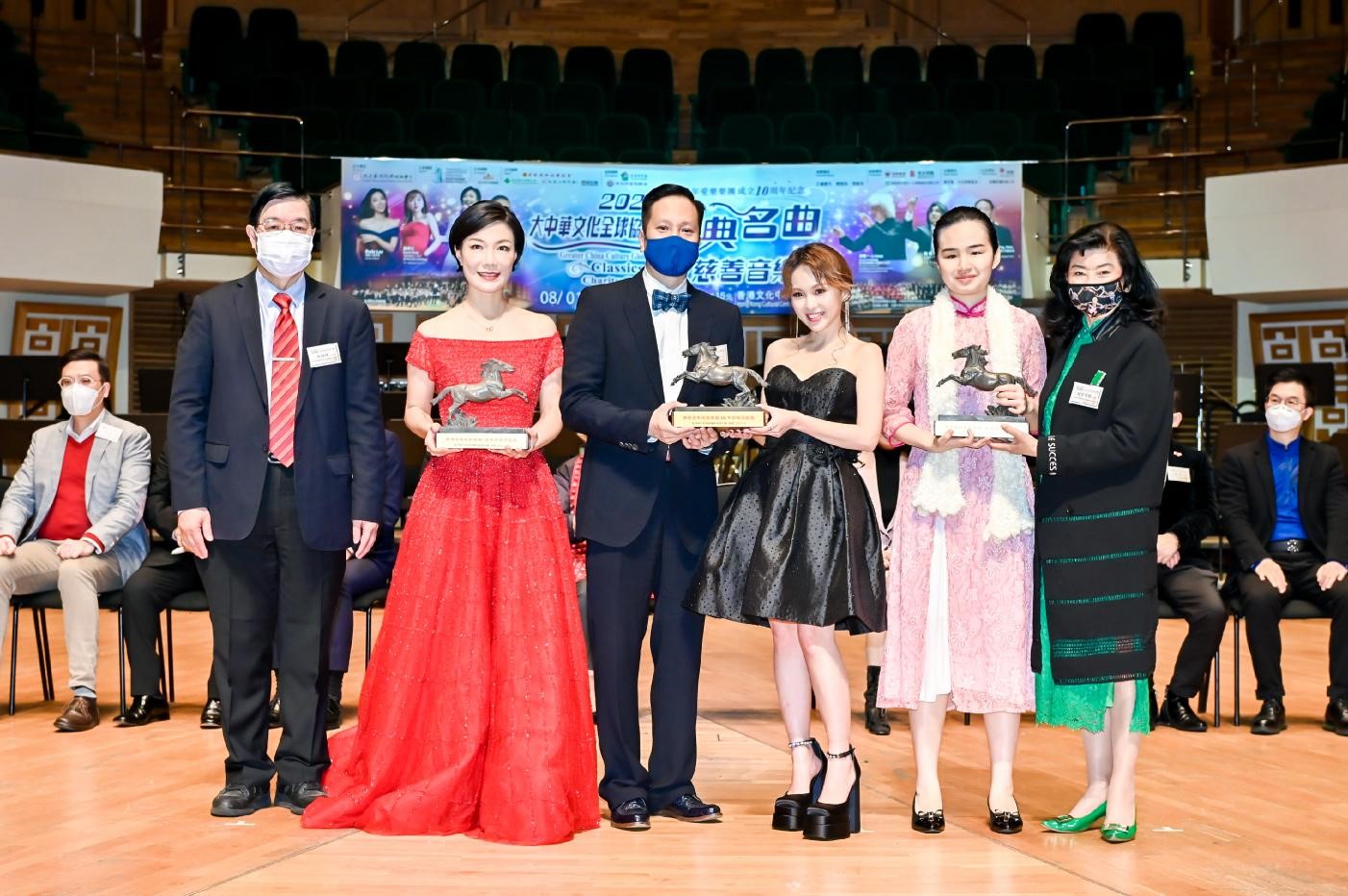 香港青年爱乐乐团慈善基金会永远荣誉主席赵曾学韫(右一),主席蔡朝旭(中),创会副主席林启晖(左一)为驻团艺术家萧凯恩(右二)、龚柯允(右三)、龙婷(左二)颁发纪念品