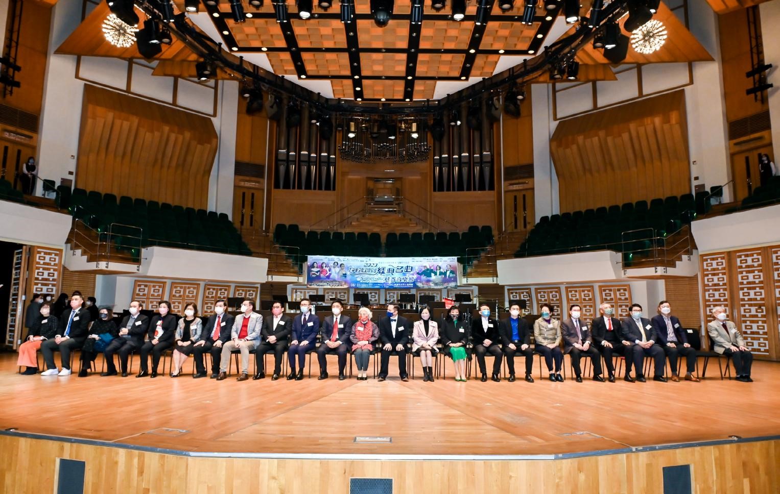 演出现场,主办单位代表香港青年爱乐乐团慈善基金会主席蔡朝旭先生、合办单位代表深水埗民政事务专员黄昕然太平绅士陪同各位主礼嘉宾到台上就座。
