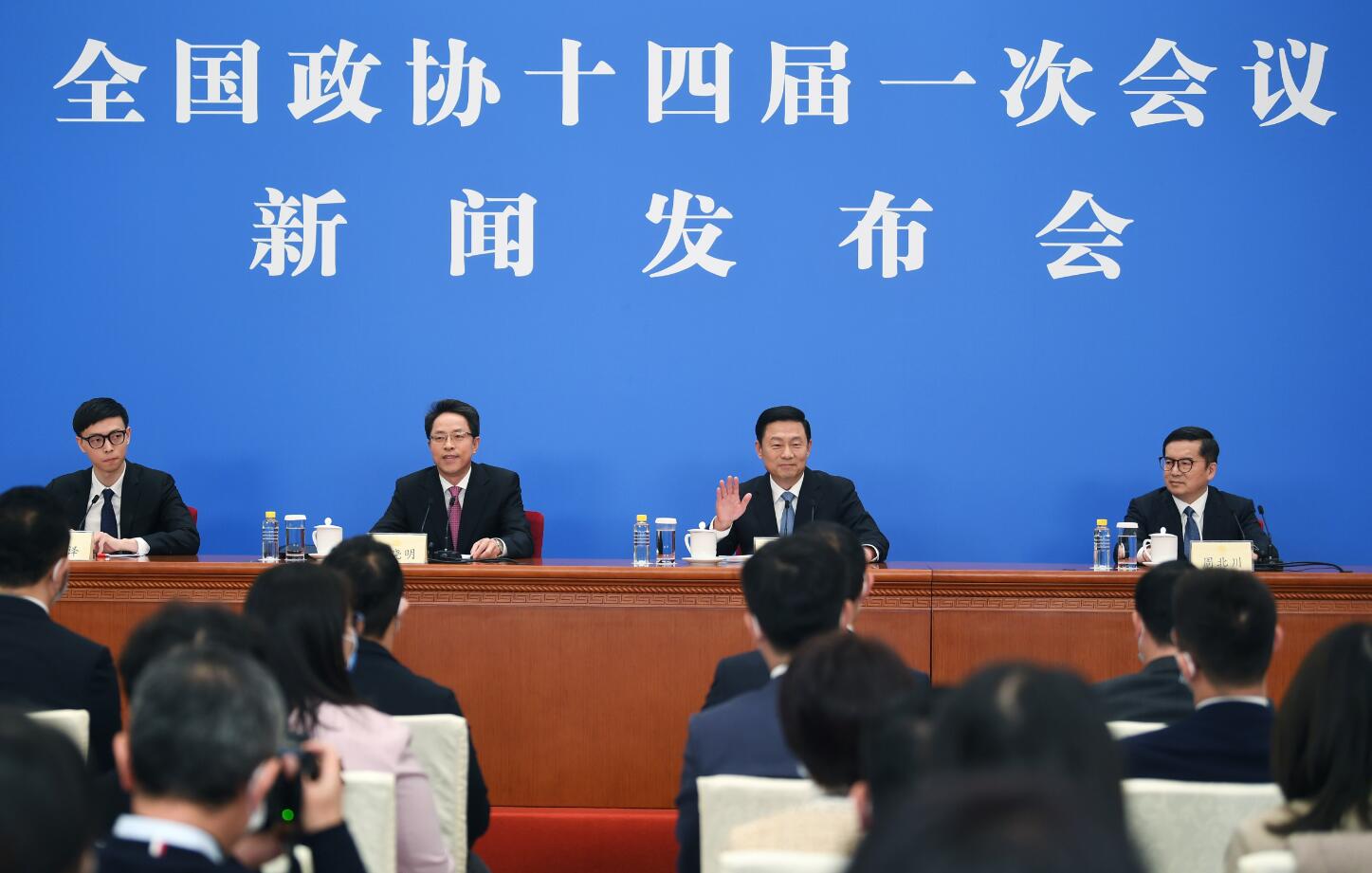 16时30分,新闻发言人郭卫民步入大厅,全国政协十四届一次会议新闻发布会正式开始。
