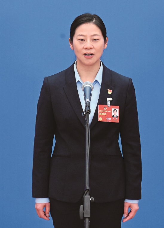 3月11日,全国政协十四届一次会议第三场“委员通道”集体采访活动在北京人民大会堂新闻发布厅举行。这是全国政协委员余静在接受媒体采访。人民政协报记者 贾宁 摄