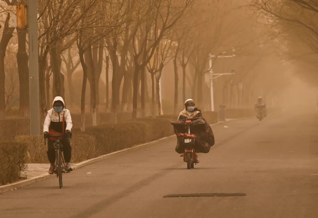 △4月10日,市民在呼和浩特市街道上骑行。当日,我国北方多地出现沙尘天气。新华社记者 刘磊 摄