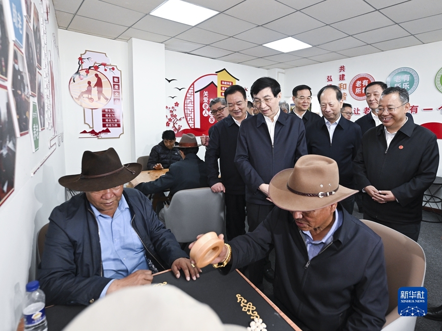 7月25日至27日,中共中央政治局常委、全国政协主席王沪宁在西藏调研。这是7月27日,王沪宁在拉萨城关区八廓街道鲁固社区民族团结进步之家考察。新华社记者 燕雁 摄