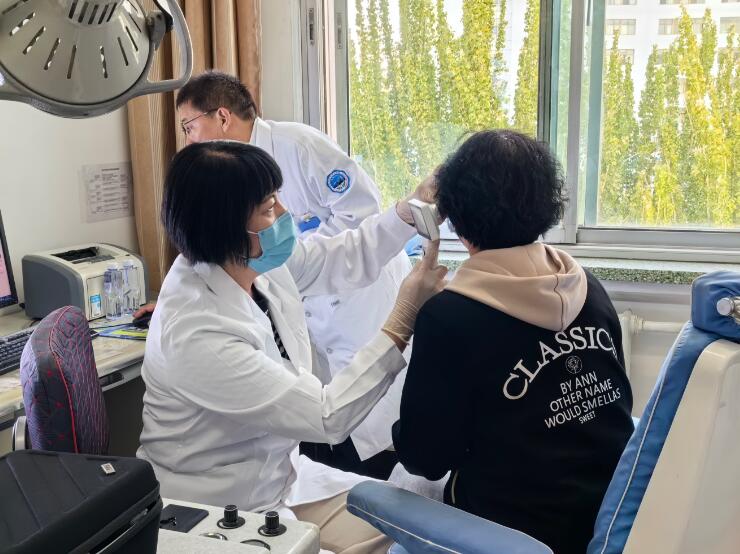 全国政协委员、解放军总医院第六医学中心耳鼻咽喉头颈外科医学部耳鼻咽喉内科主任王秋菊为患者义诊