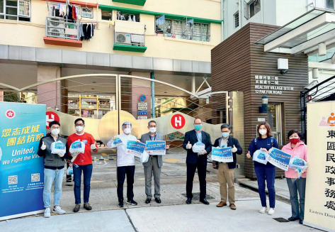 2022年4月4日,陈仲尼(左三)在香港北角健康邨派防疫包