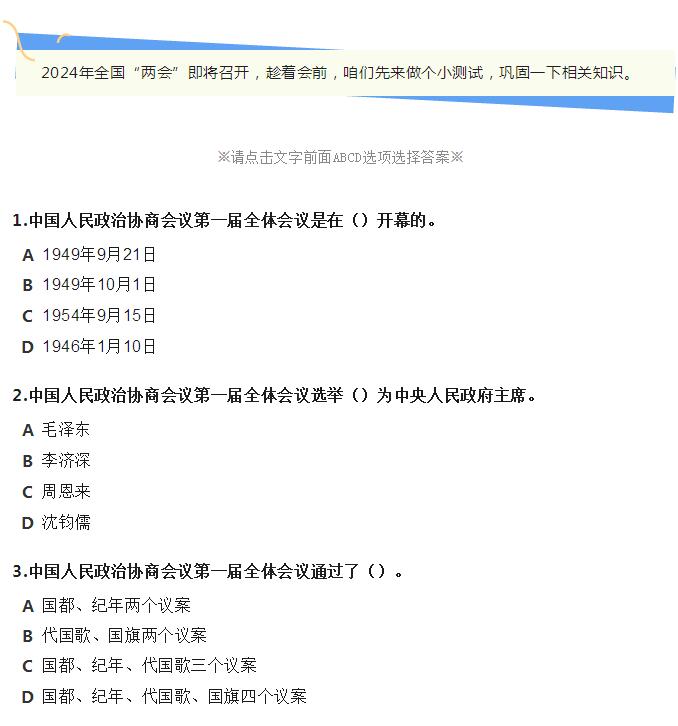 “两会”问答① | 中国人民政治协商会议第一届全体会议在____开幕?