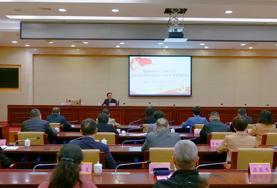 在宣讲中,徐绍川深刻阐述了习近平新时代中国特色社会主义思想的重大意义、主要内容和世界观方法论,全国两会精神和习近平总书记对广西重大方略要求的重要意义、深刻内涵和实践要求。他表示,要把学习贯彻习近平新时代中国特色社会主义思想作为一项长期的重要政治任务,与深入学习贯彻全国两会精神和习近平总书记关于做好新时代党的统一战线工作的重要思想、关于加强和改进人民政协工作的重要思想紧密结合起来,与深入贯彻落实习近平总书记对广西重大方略要求紧密结合起来,解放思想、创新求变,向海图强、开放发展,扎实做好思想引导、汇聚力量、议政建言、服务大局各项工作,为奋力谱写中国式现代化广西篇章汇聚智慧和力量。