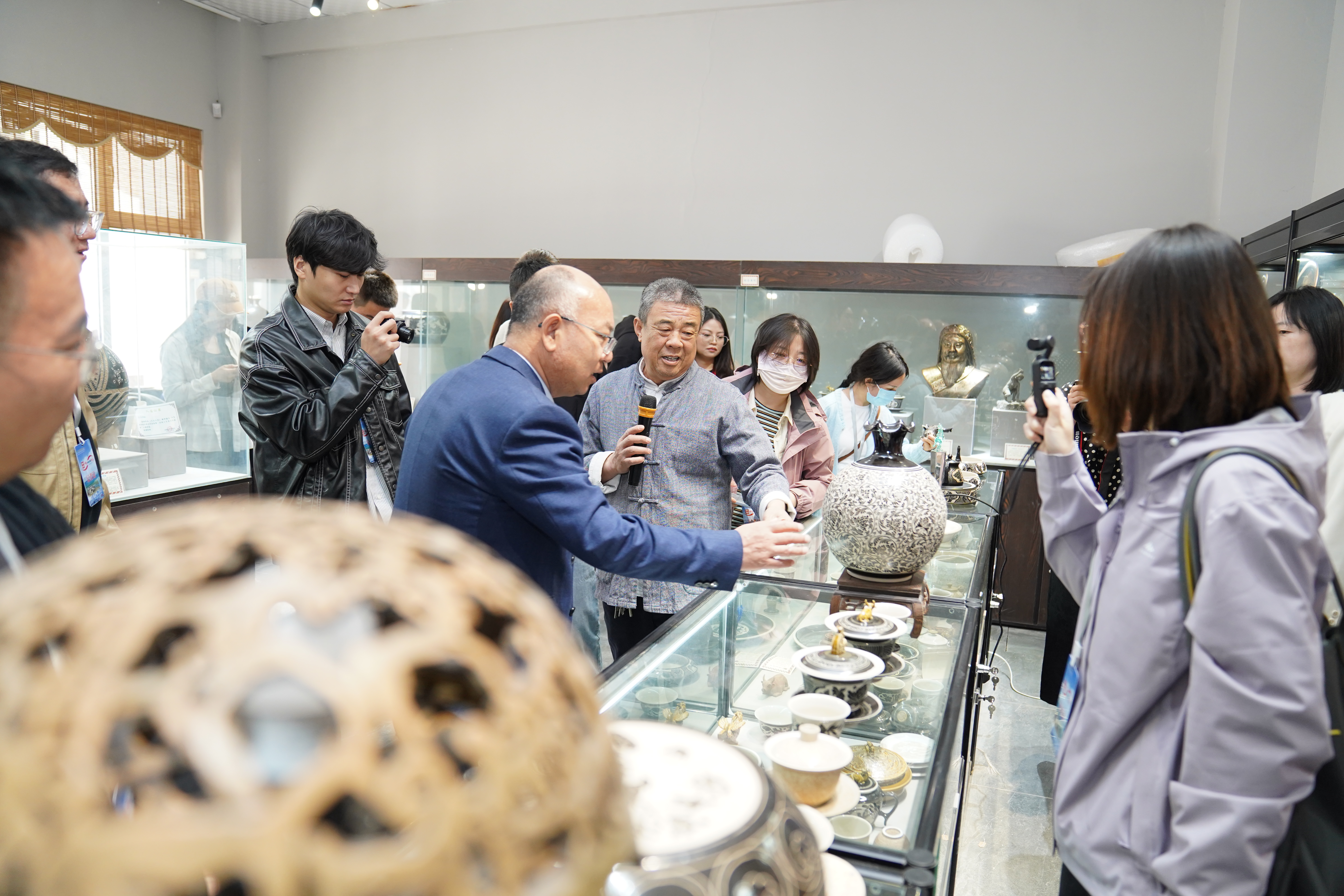 在贺兰县文创基地五奎陶瓷艺术馆内,十届贺兰县政协委员、自治区级非遗西夏瓷代表性传承人李五奎向采访团一行讲解陶瓷烧制作品和制作工艺。人民政协网记者赖仁杰 摄