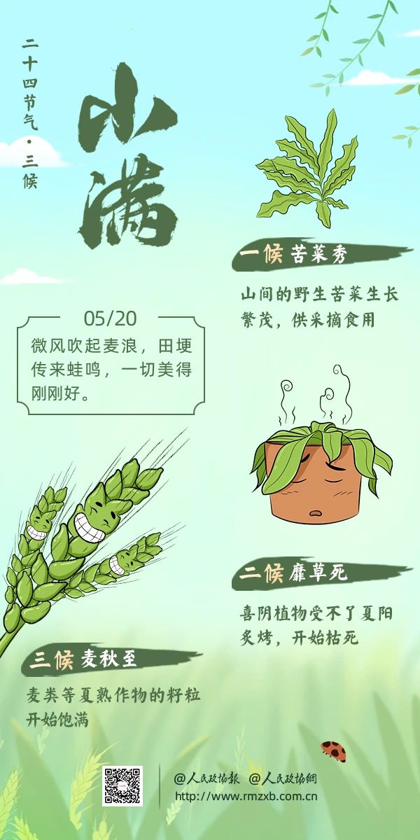 今日,我们迎来小满节气。“小满者,物致于此小得盈满?!闭飧鍪苯冢÷笳倒嘟?,麦粒看起来好像饱满了,其实还只灌了个“半饱”,并未成熟,故称“小满”。“小满小满,江河渐满”。南方雨水充盈,江河湖塘水量渐渐丰沛,桑叶正肥,新蝉鸣叫,樱桃转红,青杏渐黄,盛夏的特征日渐清晰。
