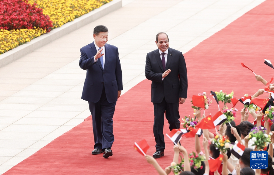 5月29日下午,国家主席习近平在北京人民大会堂同来华出席中国-阿拉伯国家合作论坛第十届部长级会议开幕式并进行国事访问的埃及总统塞西举行会谈。这是会谈前,习近平在人民大会堂东门外广场为塞西举行欢迎仪式。新华社记者 翟健岚 摄
