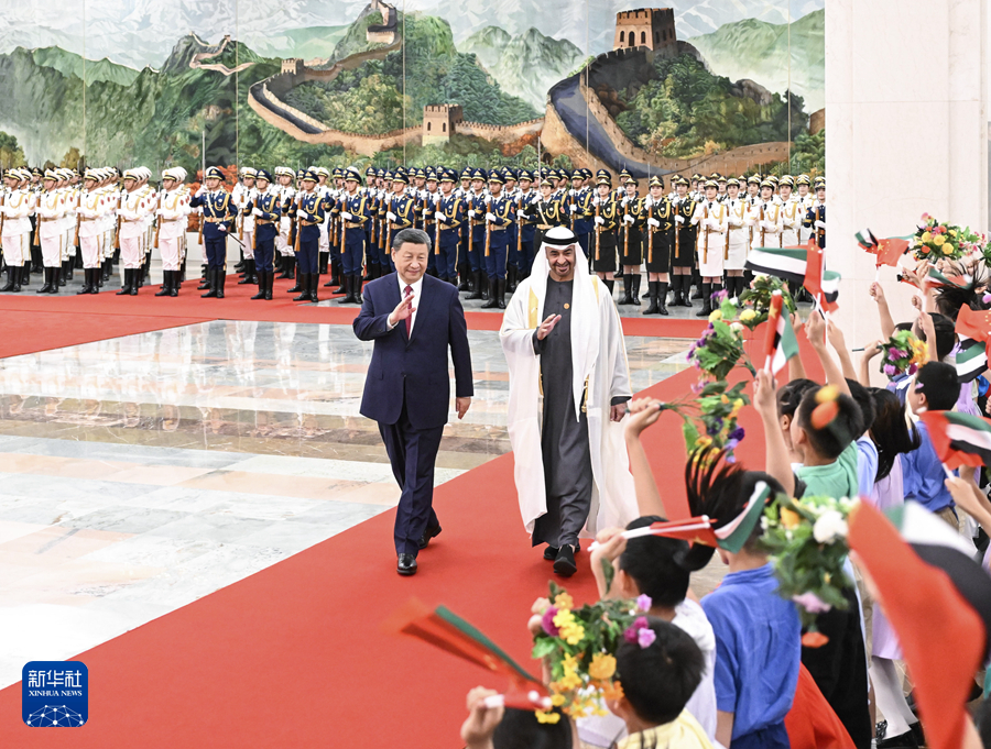 5月30日下午,国家主席习近平在北京人民大会堂同来华国事访问并出席中国-阿拉伯国家合作论坛第十届部长级会议开幕式的阿联酋总统穆罕默德举行会谈。这是会谈前,习近平在人民大会堂北大厅为穆罕默德举行欢迎仪式。新华社记者 饶爱民 摄