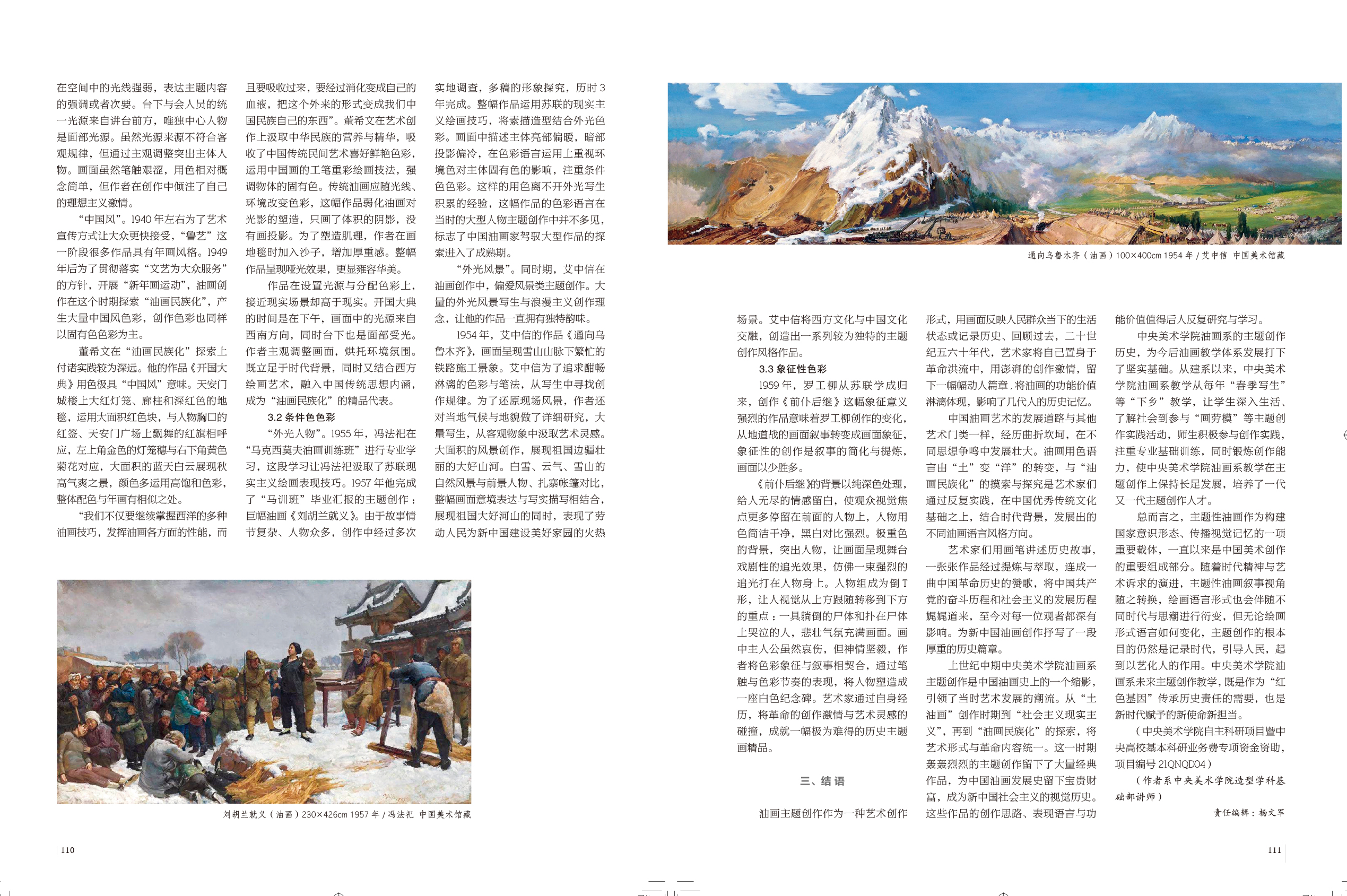 新中国成立后,油画语言探索与新中国重大历史主题结合,在20世纪五六十年代主题创作更是因为党和政府对油画的重视,让这个时期油画主题性创作发展迅速。新中国成立初期,中央美术学院油画系教师团队是经历北平艺专与延安鲁艺的实践经验的精英重组形成的团队,他们创作的大量主题性油画作品成为新中国油画史上的代表作品。