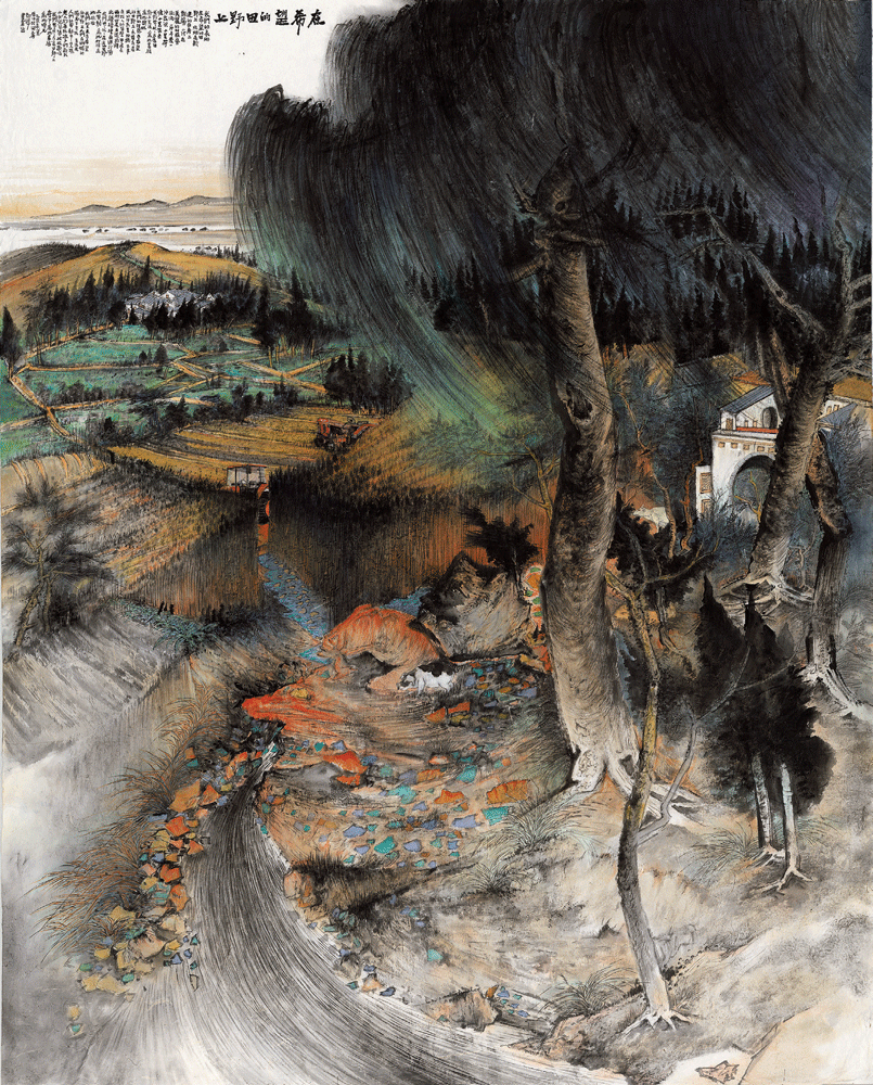 常朝晖创作的《在希望的田野上》顺应并融入中国传统自然生态观规律,将天地万物的自然状态通过“道”的体现,达到一种“无为”的“常自然”。这种“常自然”是具有一种“虚静朴素”和本真不加修饰的自由状态。在创作中,他突破传统意义上的“随类赋彩”,提炼和吸收西方的色彩观和运笔方式,将画面中的迤逦山路、稻田麦地运用统一的块面渲晕,运用不同色块之间的融色与破色产生一种未知的色彩碰撞。他借助色彩观照内心的真实,表现出自然物象鲜活的生命力,让观者通过色彩的变化去领会大自然的内在精神和生命体悟。