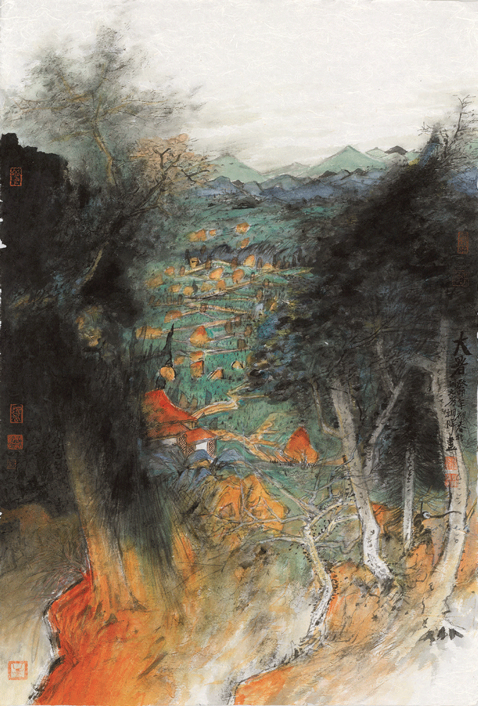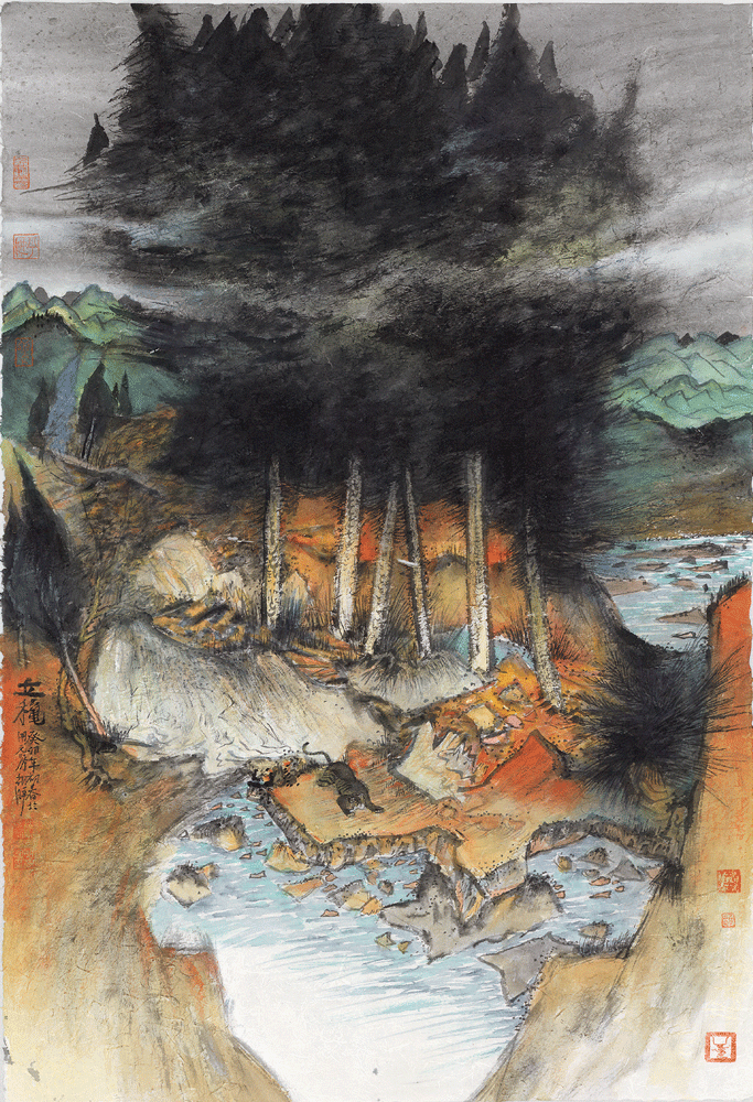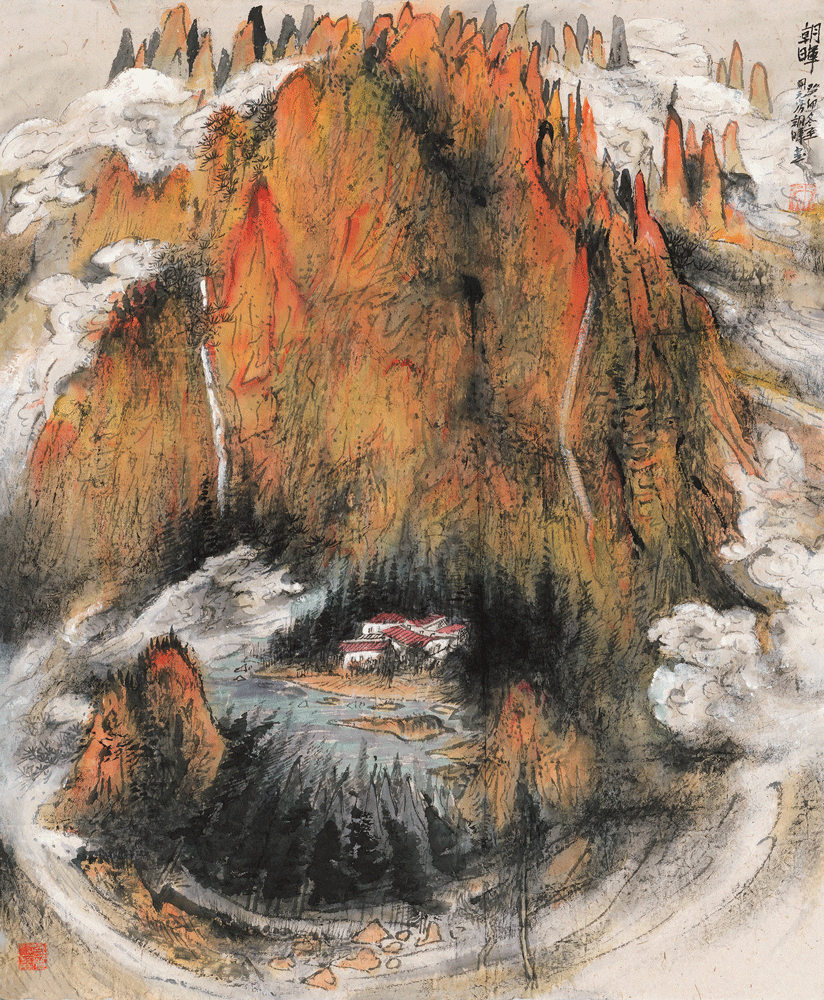 中国传统青绿山水的色彩观与阴阳五行说有密切关系,有丰富的概括性与象征性,蕴含着中国传统的哲学思想。常朝晖在继承传统色彩观念的基础上,不断推陈出新。他的山水画将“色”与“墨”分开而论,一是不以“复古”为目的,墨画要抓住线稿和墨色的基本功;二是提倡“以情运色”,将感情注入到色彩渲染之中。