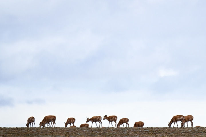 藏羚羊在青??煽晌骼镂宓懒旱厍ㄡ悖?024年5月27日摄)。新华社记者 张龙 摄