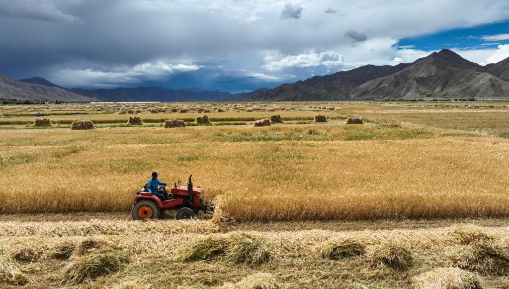 9月10日,在西藏日喀则市白朗县巴扎乡拍摄的秋收场景(无人机照片)。新华社记者晋美多吉 摄