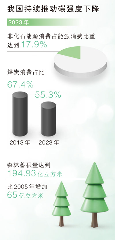 中国采取一系列行动,全面推动国家自主贡献实施并取得积极成效。“我国持续推动碳强度下降,2023年非化石能源消费占能源消费比重达到17.9%,煤炭消费占比从2013年的67.4%降至55.3%;森林蓄积量达到194.93亿立方米,比2005年增加了65亿立方米?!毕挠ο越樯?,截至2024年7月底,风电、太阳能发电总装机容量达到12.06亿千瓦,是2020年底的2.25倍,提前6年多实现了2030年装机容量目标。