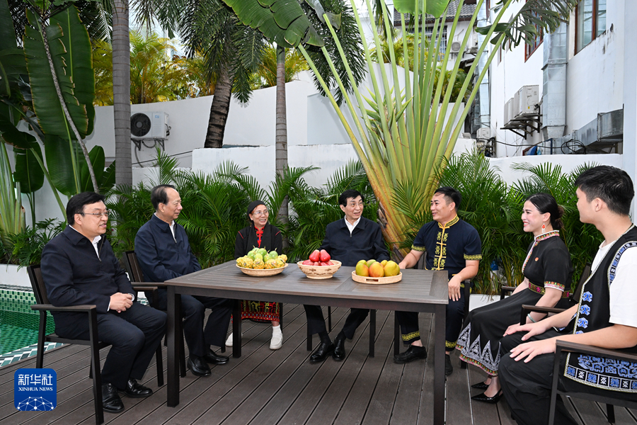 11月20日至22日,中共中央政治局常委、全国政协主席王沪宁在海南调研。这是11月21日,王沪宁在三亚市吉阳区博后村看望黎族群众。新华社记者 饶爱民 摄