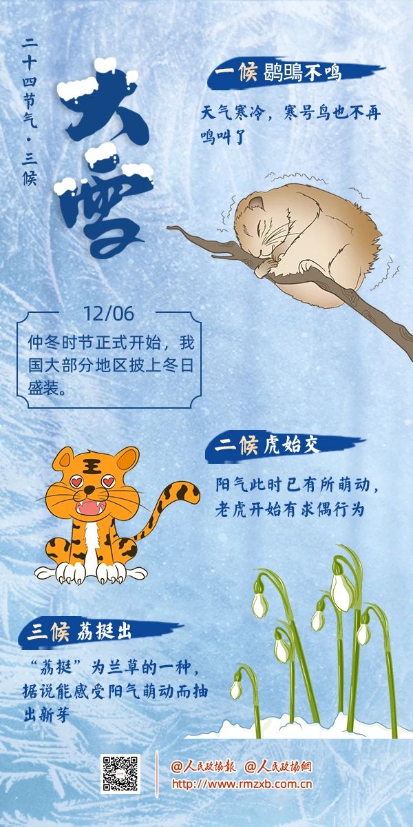 大雪有三候:一候鹖鴠不鸣,二候虎始交,三候荔挺出。大雪时节,因天气极度寒冷,连寒号鸟也不再鸣叫了。此时是阴气最盛的时候,所谓盛极而衰,阳气已萌发,老虎开始有求偶行为;一种叫做荔挺的兰草,也由于感到阳气的萌动而抽出新芽。在寒风的吹动下,片片雪花洒落,落在屋檐,落满田野。