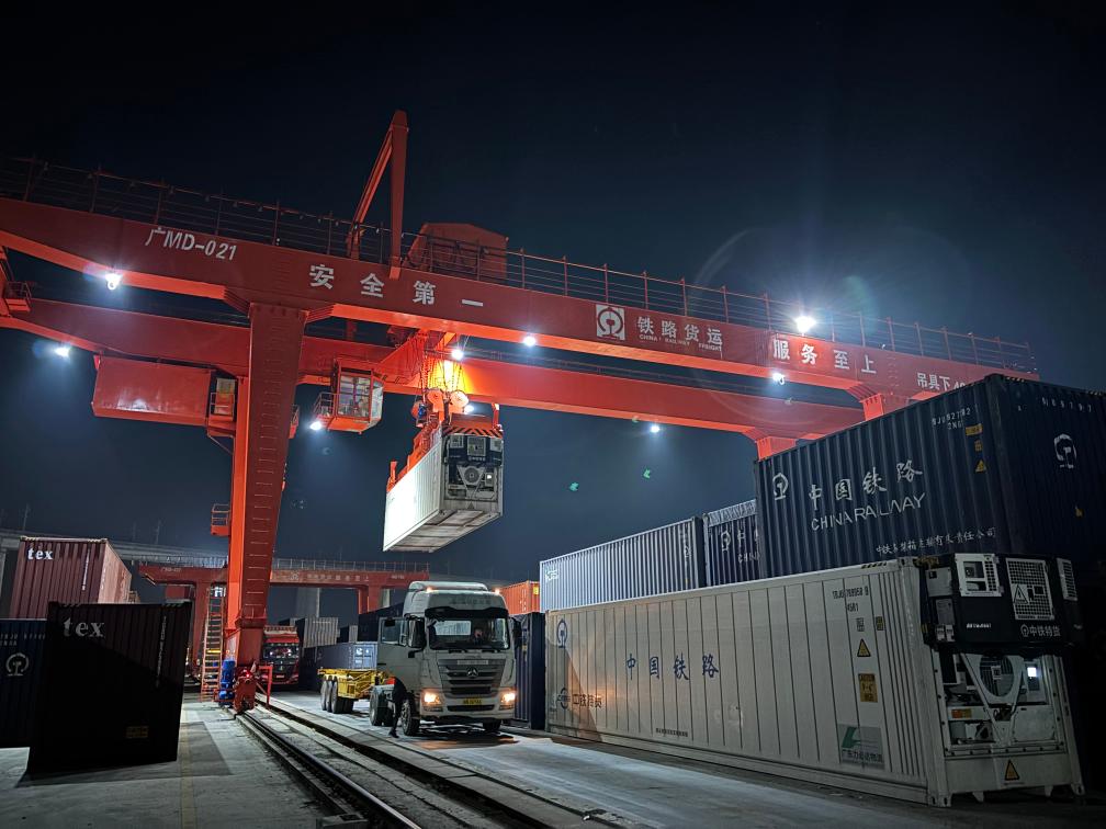 1月17日凌晨,在湖南怀化国际陆港,龙门吊正在将冷链集装箱吊装到卡车上。新华社记者余春生 摄