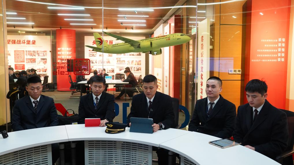 李富新(左三)和乘务组、安全员在内的所有机组成员召开航前准备会。新华社记者狄春 摄