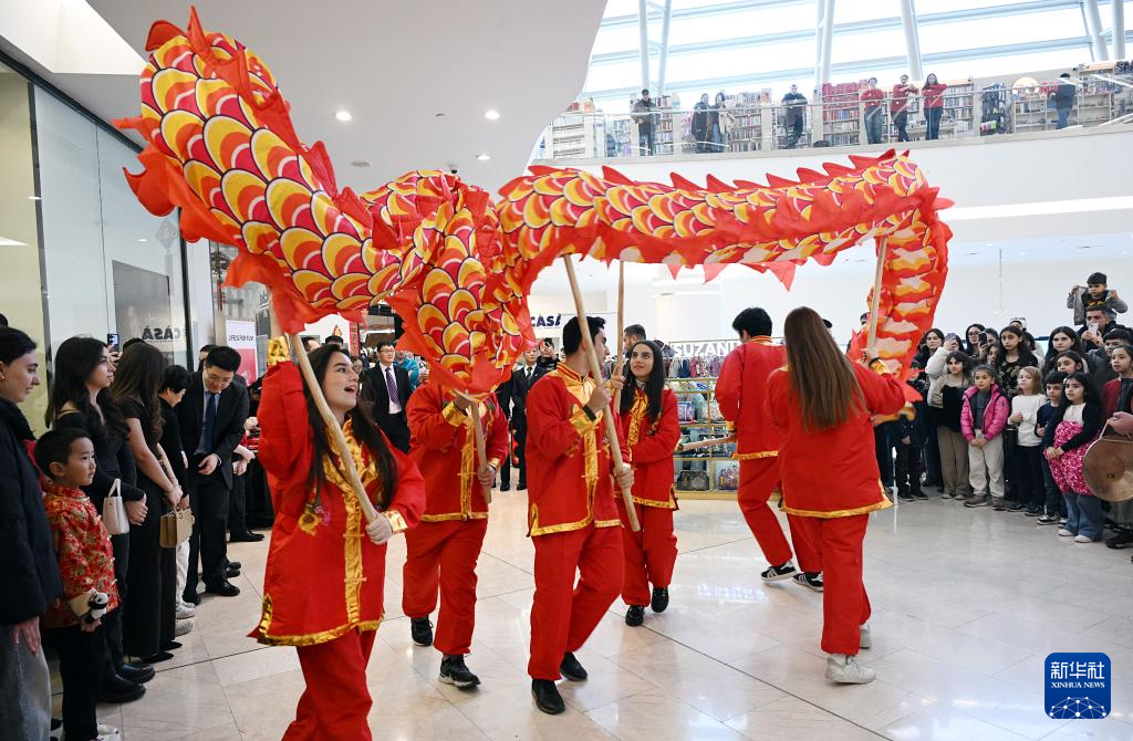 1月25日,在阿塞拜疆首都巴库举行的春节文化体验活动上,来自巴库国立大学孔子学院的代表表演舞龙。新华社发(托菲克·巴巴耶夫摄)