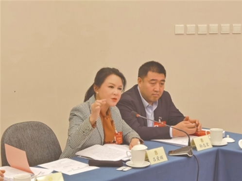 吕爱辉(左一)在全国政协十四届二次会议期间的小组讨论中发言。