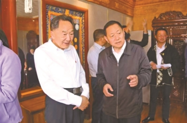 蒋建国(左一)在四川省调研深入推进藏传佛教中国化相关工作。