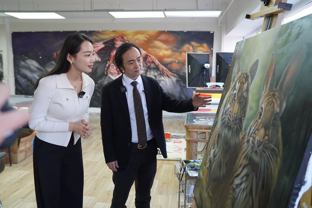 △全国政协委员舒勇为记者介绍“虎兔融合”画作。
