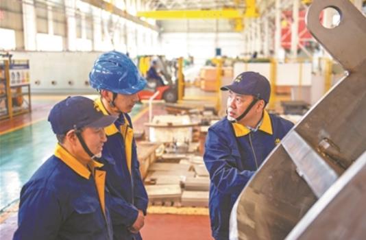 严建文在工厂和工人讨论核聚变真空室部件加工。