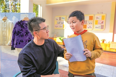 黄秋停(左)在校园里给学生们讲述非遗故事。(图片由受访者提供)