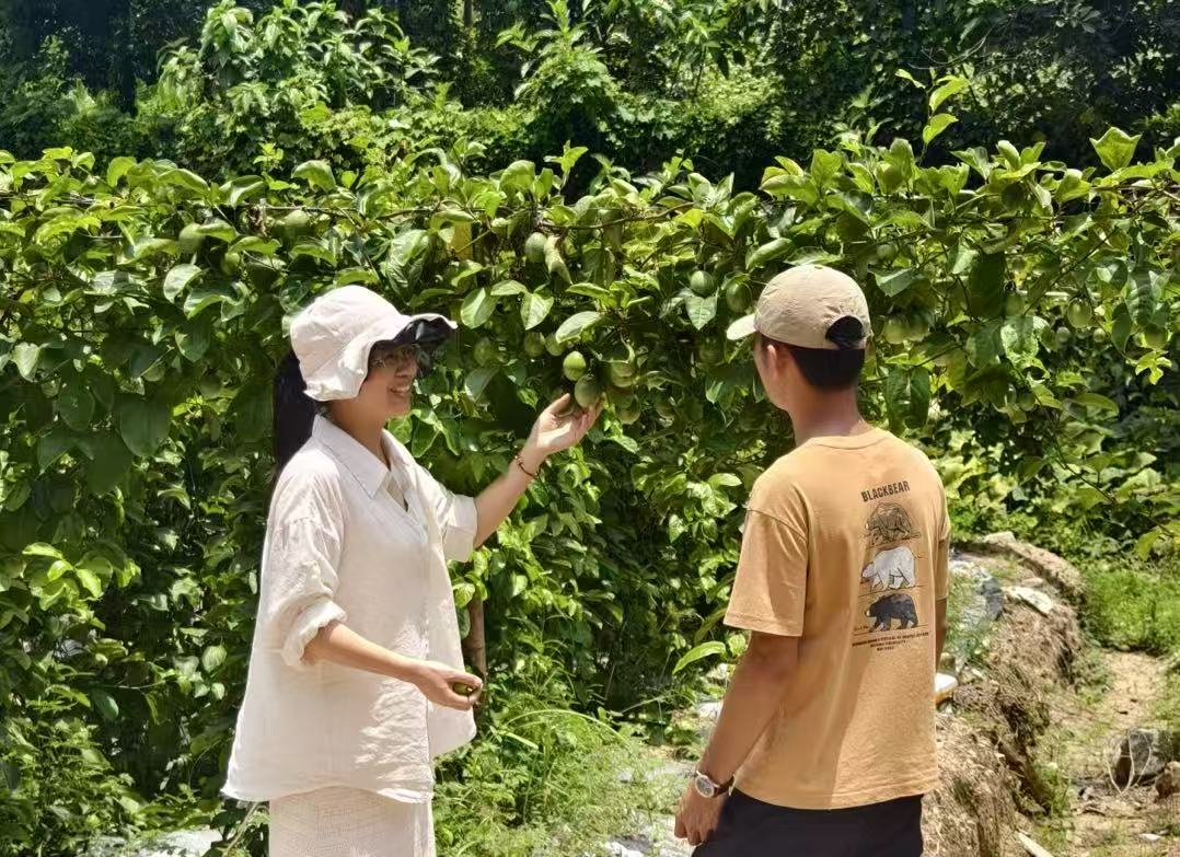 宋海漫(左)在果园与种植户交流。 (图片由受访者提供)