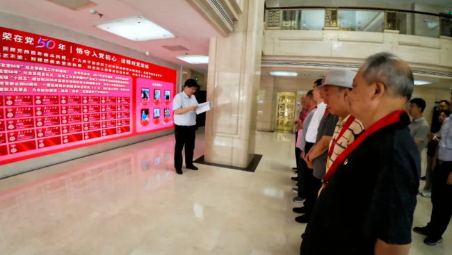 老党员们来到“光荣在党50年”荣誉墙前,庄重地贴上写有自己名字的荣誉牌。