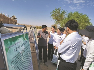 麻守仕(左一)在敦煌阳关博物馆开展“防沙治沙”宣传。(图片由受访者提供)