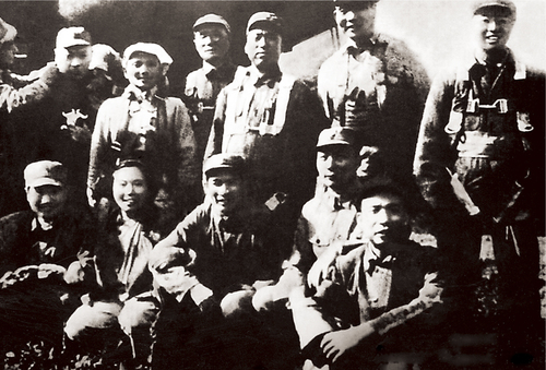 1945年8月25日,刘伯承(立、右四)、邓小平(立、右五)奉中共中央军委之命从延安飞返太行区指挥上党战役,在机场同陈毅(立、左一)、聂荣臻(坐、右二)、李富春(坐、右一)、蔡树藩(坐、左三)、滕代远(立、右三)、陈赓(立、右一)、肖劲光(立、右二)等合影留念。