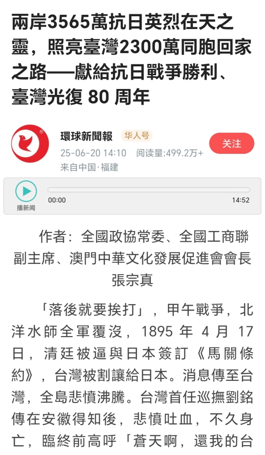 一段时间来,张宗真埋头扎进史料、笔耕不辍,先后撰写了《马关之殇:台湾军民孤岛抗日的悲壮史诗——献给台湾光复80周年》《两岸3565万抗日英烈在天之灵,照亮台湾2300万同胞回家之路——献给抗日战争胜利、台湾光复80周年》《日本大屠杀手无寸铁的40万台湾同胞与一位“反共”将军的觉醒之路》《五万台湾儿女“寻找祖国三千里”、奔赴大陆参与全民抗战》等文章;与此同时,兼任澳门中华文化发展促进会会长的他牵头筹备着在澳门举行相关内容的图片、史料、书画展及学术交流论坛,并拍摄专题宣传片,“将于今年10月25日台湾光复日当天在港澳台地区播出”。