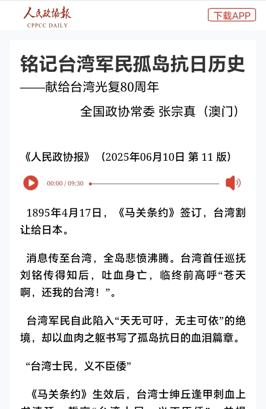 张宗真表示,正逢举国上下团结一心纪念抗战胜利80周年和台湾光复80周年之际,发挥与台湾民间交流交往的独特优势,传播真相,弘扬伟大的爱国精神,服务国家对台工作,是澳门重要的时代任务。作为澳区全国政协委员,在重大历史关口更要立场坚定、发挥双重积极作用。“在中华民族最接近民族复兴的新时代,我们每个人都应肩负使命,将集体的民族记忆和民族精神铭刻于心,更要推动其薪火相传。”(本报记者 李寅峰)