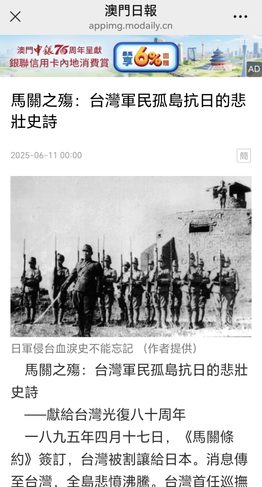 在《马关之殇:台湾军民孤岛抗日的悲壮史诗——献给台湾光复80周年》一文中,他这样写道: