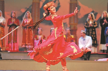 2015年4月,大型歌舞剧《丝路上的中国梦·永远的麦西热甫》在人民大会堂上演。迪丽娜尔·阿布拉担任总导演并领衔出演。(图片由受访者提供)
