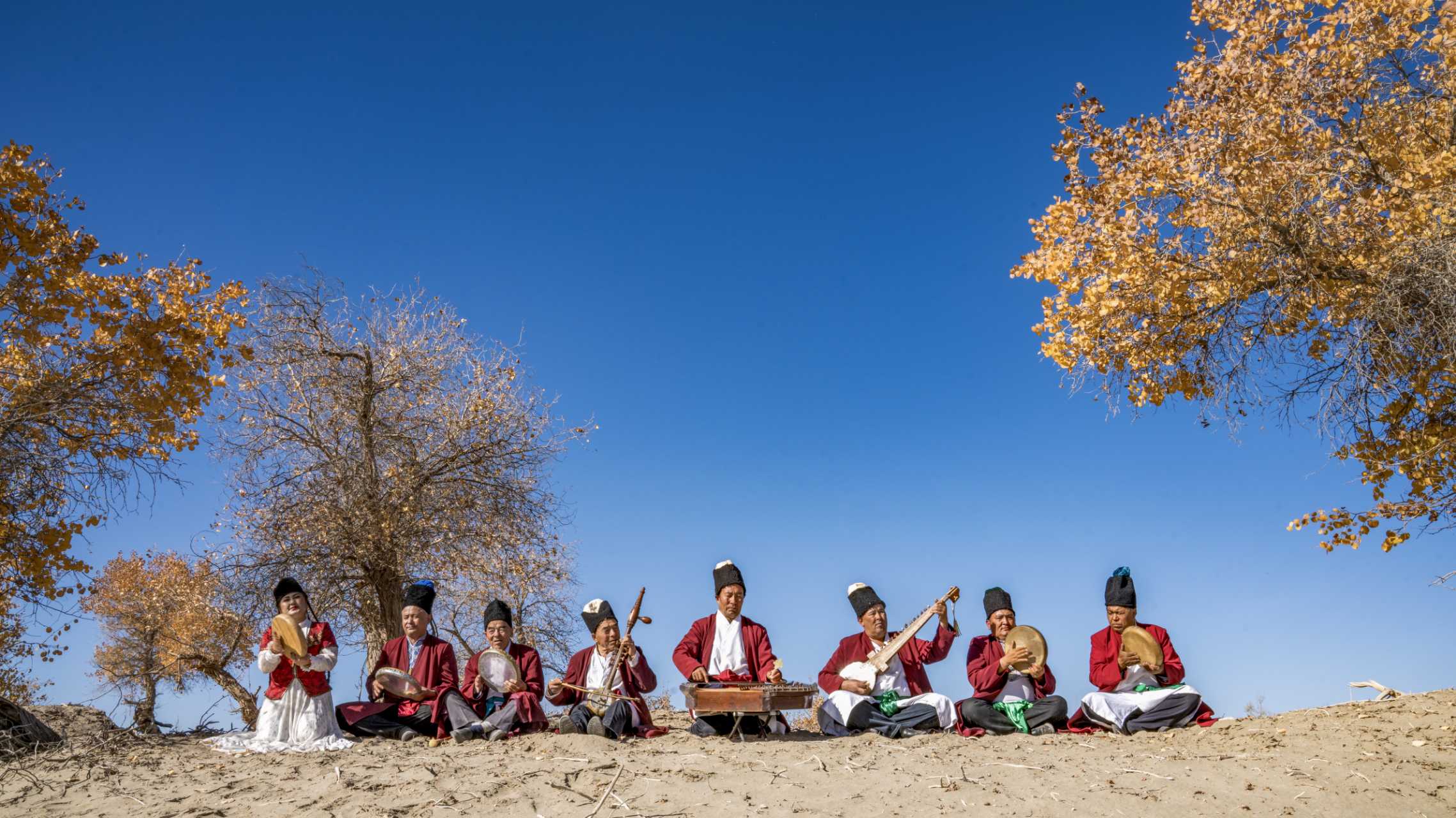 新疆喀什地区麦盖提县的刀郎麦西来甫非遗传承团队在演奏。高嵩 摄