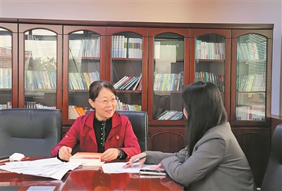 王艳芳(左)正在与基层同志交流。(图片由受访者提供)