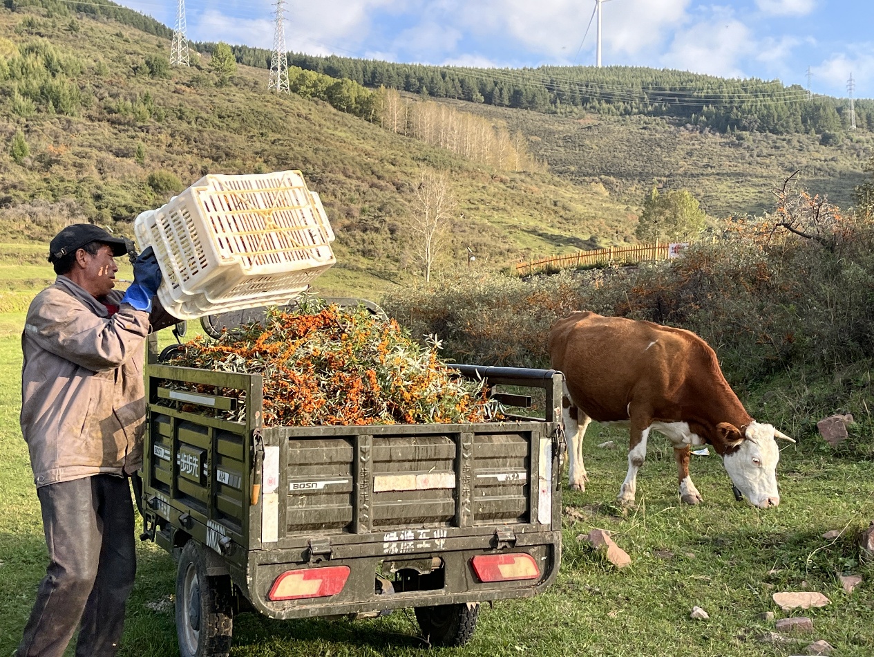 ▲村民正在采收沙棘果。成保文|摄