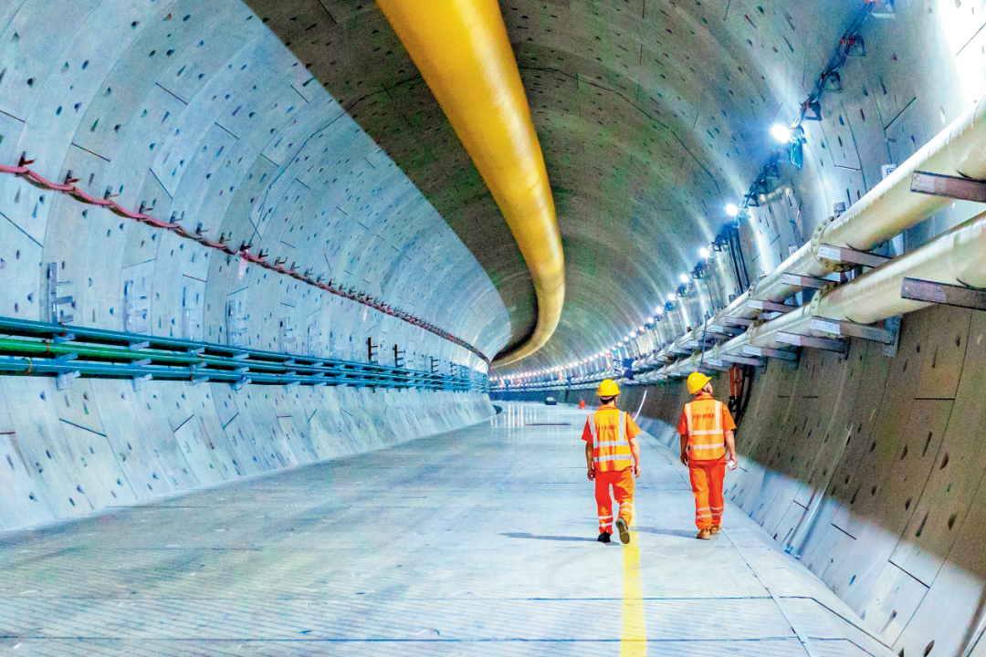 ▲2025年8月28日,京滨城际铁路天津机场2号隧道完成盾构掘进,实现顺利贯通。图为工作人员在隧道内巡检。(新华社发 王晓婧/摄)