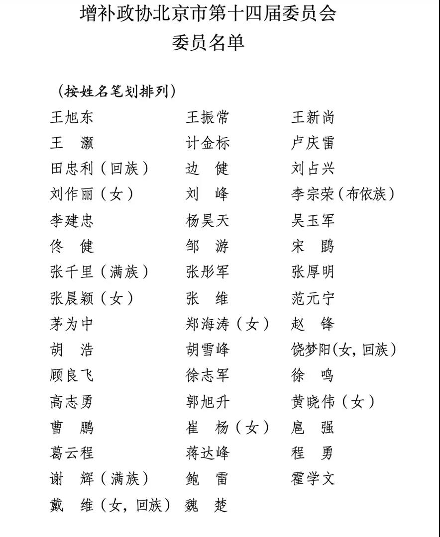 十四届北京市政协增补王旭东等47人为政协委员