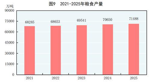 全年粮食产量71488万吨,比上年增加838万吨,增产1.2%。其中,夏粮产量14975万吨,减产0.1%;早稻产量2851万吨,增产1.2%;秋粮产量53662万吨,增产1.5%。谷物产量66021万吨,比上年增产1.2%。其中,稻谷产量20904万吨,增产0.7%;小麦产量14007万吨,基本持平;玉米产量30124万吨,增产2.1%。大豆产量2091万吨,比上年增产1.3%。